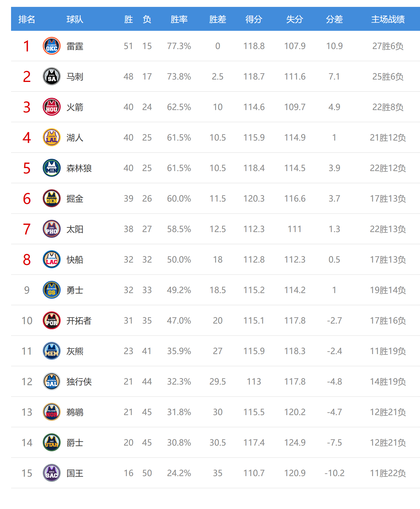 今日比赛后火箭、湖人、森林狼排名互换,其他西部球队排名不变。